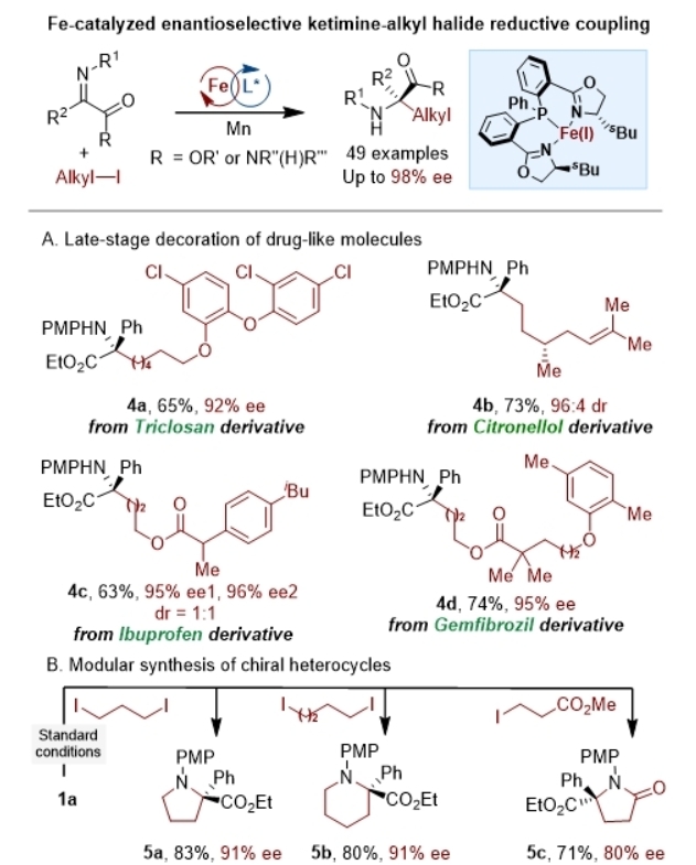 图. 铁催化亚胺与烷基碘的不对称还原偶联及药物修饰